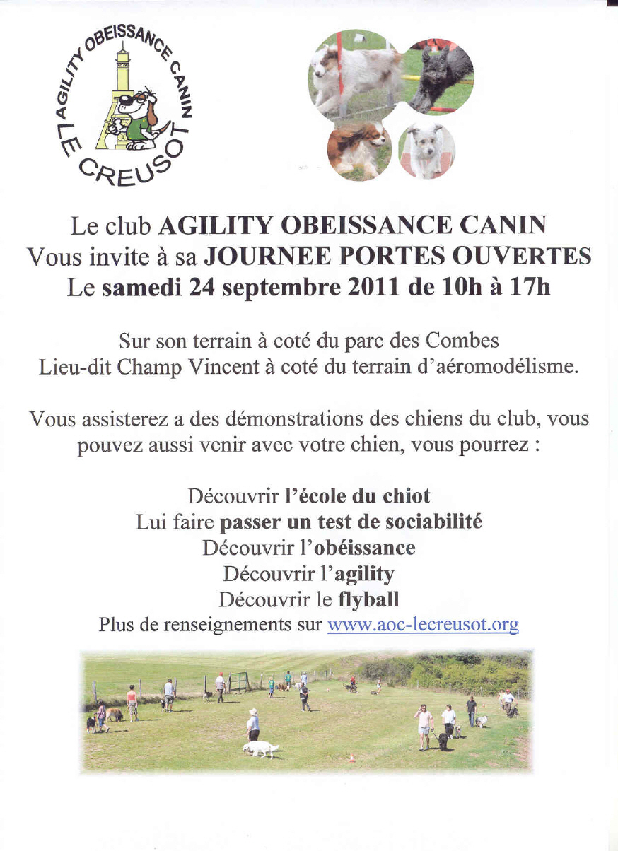 Le club organisait sa première journée portes ouvertes, le samedi 24 septembre 2011. Le beau temps était de la partie, dès le matin, et tout au long de la journée de nombreuses personnes sont venues découvrir nos activités et prendre des renseignements. De nombreux tests de sociabilité ont étés obtenus, et un grand nombre de chiots ont pris un premier contact avec le club. Les visiteurs ont pu assister à des démonstrations d'obeissance, de flyball, et d'agility, et rencontrer les chiens visiteurs.